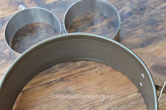 Daarom gebruikte ik de ring mijn 19 cm. springvorm. En omdat ik nog wat deeg over had maakte ik nog enkele kleine taartjes met kookringen. De grote taart was mooi maar de kleintjes waren toch ook bijzonder leuk.